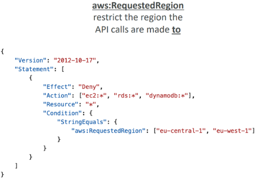 - 예시에서는 eu-central-1, eu-west-1에서 EC2, RDS, DynamoDB 호출을 제한