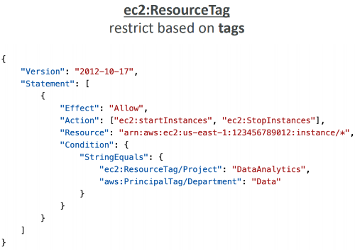 - 예시에서는 EC2의 ResourceTag/Project 태그가 DataAnalytics, PrincipalTag/Department 태그가 Data 일 때 허용