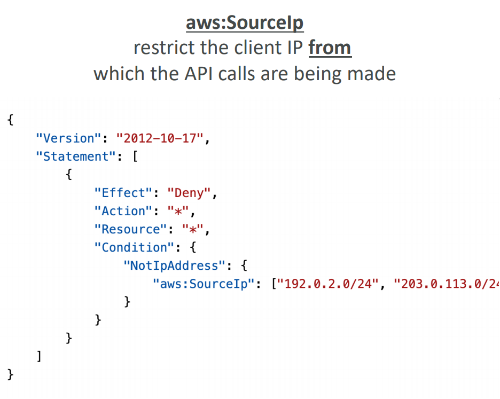 - API 호출이 생성되는 클라이언트 IP를 제한하는 데 사용되는 aws:SourceIp